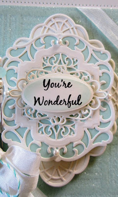 Good Sunday morning all! Think a very pale sage green and white for this one as the photographs are not picking up the true colour. It is a gorgeous green, very soft and pastel, but from my stash I'm afraid. I started by simply debossing the outer ring from the Classic Adorned Square Noble die set into my pale sage green card. I used the outer ring also, but only with the embossing mat so no actual cutting was done. I cut around it leaving a wide border and added flatback pearls to the corners. Next I cut four of the Caribbean corners in white card using the outer cut ring as well. I glued them into place on the inside of the debossed square. Next I cut the inner design from the Classic Adorned Square out of the pale green card. I backed it in white this time and mounted it in the centre in a diamond orientation. I stamped my sentiment on white card and inked lightly around it with Bundled Sage distress ink. I used the centre die from the Italian Decorative frames set and cut a frame for my sentiment. I backed it in green and added mounting foam to the back of the frame. I seated it over my sentiment and cut away the excess card. I added my sentiment in the centre of the card to complete the focal element. I finished off the card with my usual matting and layering. I decided not to doll it up with flowers so you can see how it might be used for either male or female recipients, but you certainly could add some floral embellishments if you prefer to easily change it. The finished dimensions are 8" x 8" in size.