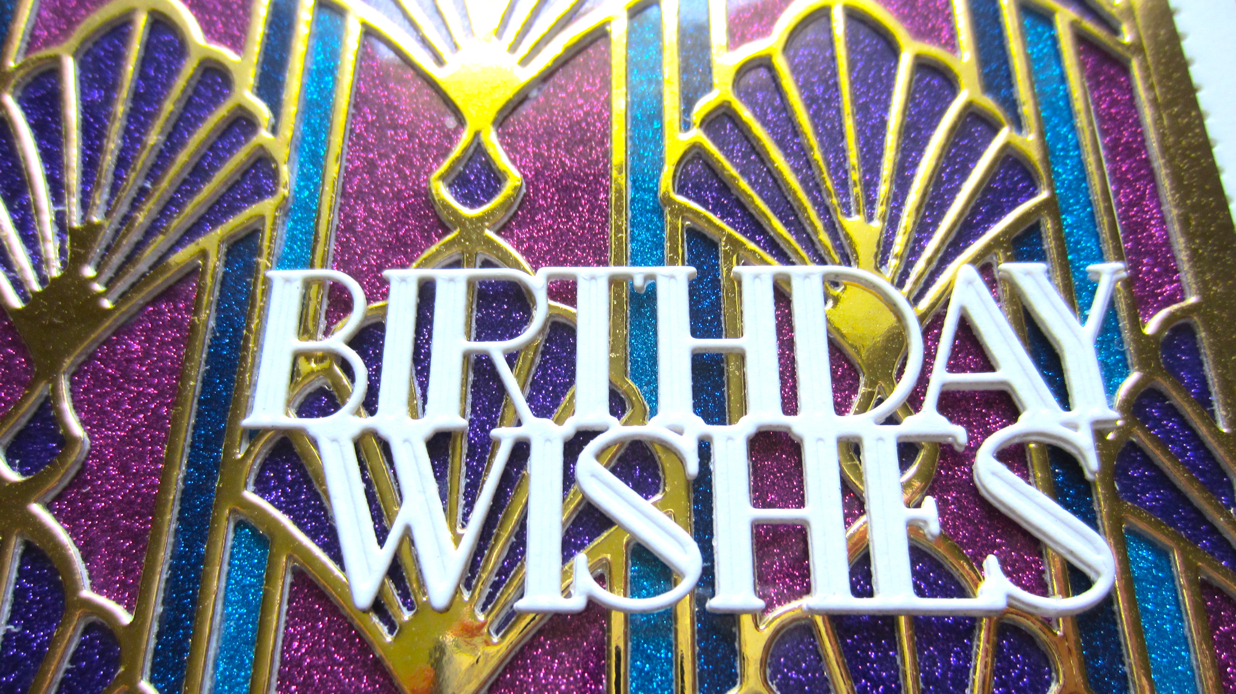 Hello crafters! I just love the colours in this card. I created it by cutting the Art Deco Fan Background in Gold Mirror card. I glued a piece of clear acetate to the back of it. Starting with the darkest colours first, I added glue to the areas that I wanted to be Canadian Blue first. I poured on the Polished silk glitter then tapped it off. Next I filled in the areas with glue that I wanted to be Antique Rose, poured the glitter over it and then tapped it off. Lastly I added glue to the areas that were Brilliant Blue and then taped off the glitter. I set it aside to dry overnight then all the glitter shows up like this! I added a piece of white card to the back (so mounting foam doesn't show through.) I cut the Art Deco Birthday Wishes sentiment in white and glued it to the bottom corner of the card. The card was completed with white and gold mirror card mats and layers. The finished dimensions are 6 1/2" x 7 1/2" in size. All for now, Sue x