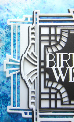 Hello bloggers!  I selected a pixied piece from my background stash for today's card.  I used Aqua Lagoon and Midnight Blue Pixie Powders on it.  Next I cut the Art Deco Ornate Tile in both black and white.  I shadowed the white one with the black die cut, then cut the middle die in black and layered it up on top.  I cut one more of the Ornate Tile in white and nipped it in half.  I added the halves to the underside of the focal element, extending the die across the card.  I added two thin black lines to the sides of the card.  I cut the Art Deco Birthday Wishes in white and glued it across the middle of the die.  The card was completed with white mats and layers.  The finished dimensions are 7"  x  9 1/4"  in size.  All for now, Sue x