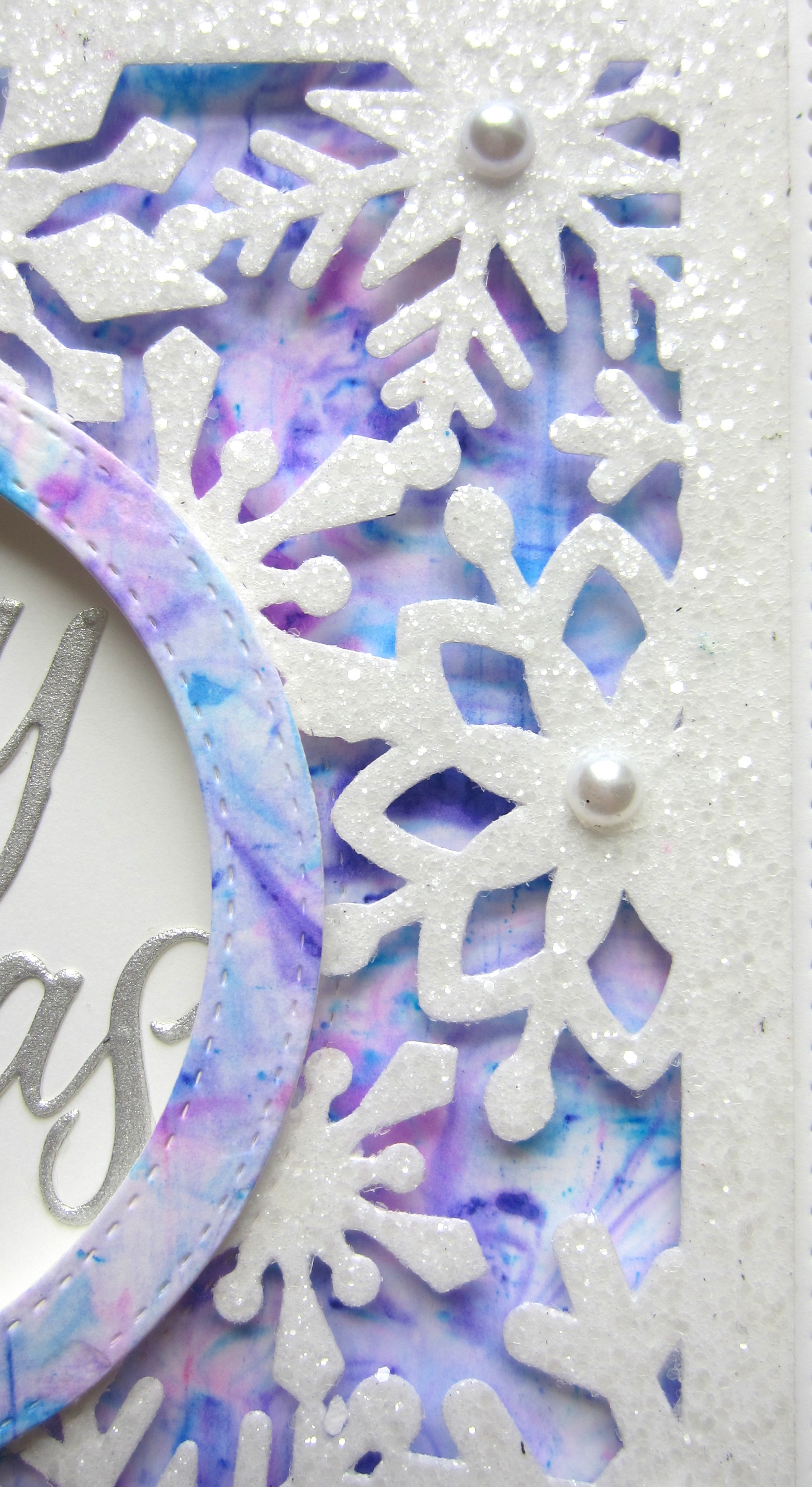 Hello bloggers! I started today's card by cutting the Snowflake Floating die out of white card. I used spray glue on it (due to the detail, it was easier than trying to cut it with a sticky adhesive sheet attached) and coated it with Frosted Sparkle Glitterbitz. I added small pieces of mounting foam to the back of it. I attached it to a piece of card that I marbled using shaving foam and assorted alcohol inks (there is a tutorial on it at the top of the blog). I had some of it leftover so I cut the oval out of it using the Double Stitched Oval die set. I added mounting foam to the back of the frame and attached it to a piece of white card. I added it to the centre of the Snowflake Floating background. I cut the Noble Merry Christmas out of silver sparkle card and glued it to the inside of the frame. The card was completed with white mats and layers. The finished dimensions are 7 1/4" x 8 1/2" in size.